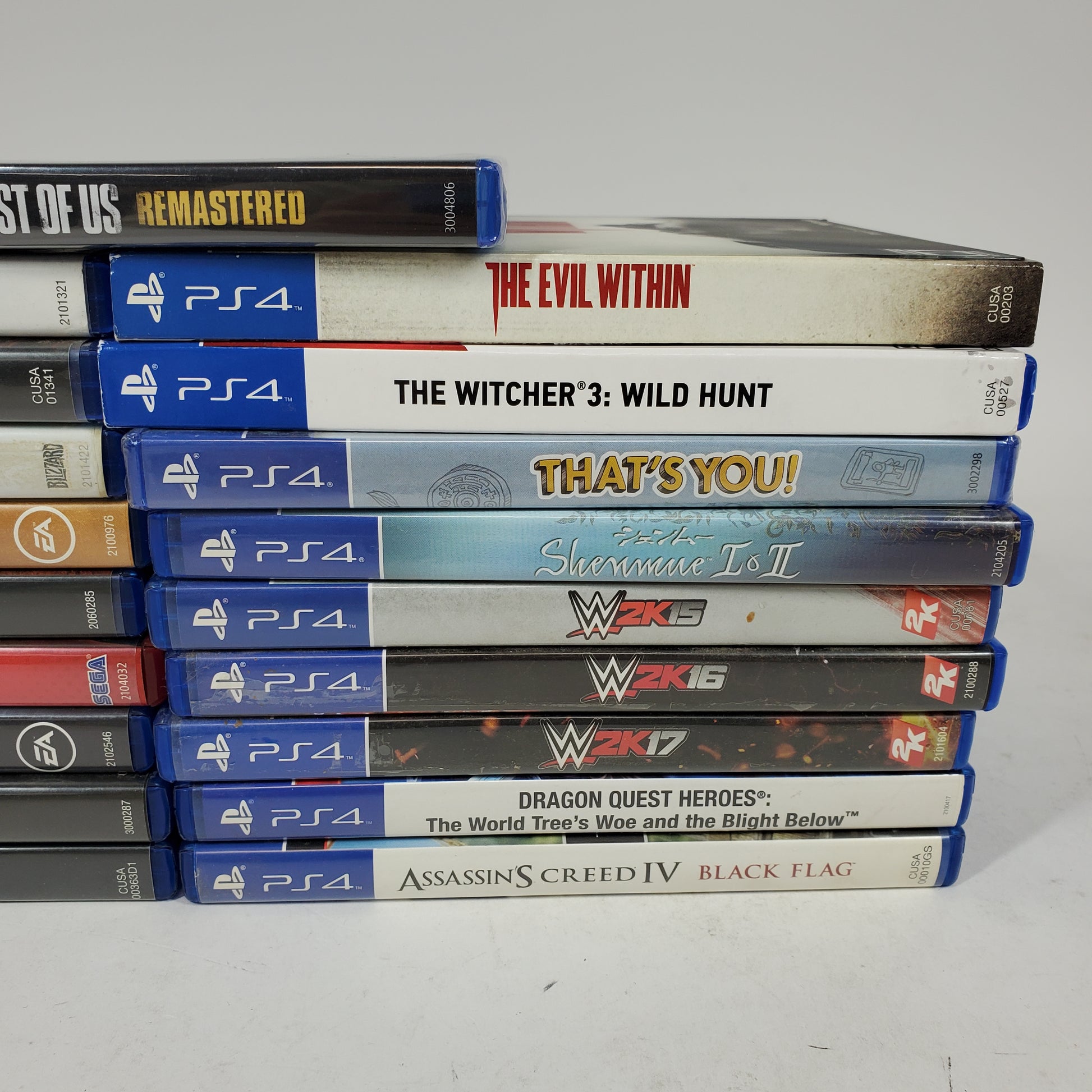 ●The Evil Within (with box/case, no manual) ●Assassin's Creed IV: Black Flag [Gamestop Edition] (with box/case, no manual) ●Dragon Quest Heroes (with box/case, no manual) ●WWE 2K17 (with box/case, no manual) ●WWE 2K16 (with box/case, no manual) ●WWE 2K15 (with box/case, no manual) ●Shenmue I & II (with box/case, no manual) ●Alien: Isolation (with box/case, no manual) ●Mad Max (with box/case, no manual) ●The Last of Us Remastered (with box/case, no manual)●Mass Effect Andromeda [Deluxe Edition] (with box/case, no manual) ●Yakuza 0 (with box/case, no manual) ●Overwatch Origins Edition (with box/case, no manual) ●Star Wars Battlefront [Deluxe Edition] (with box/case, no manual) ●Dragon Ball Xenoverse (with box/case, no manual) ● That's You (with box/case and manual) ●NHL 17 (with box/case, no manual) ●Bulletstorm: Full Clip Edition (Disc/Cartridge Only) ●Borderlands 3 (Disc/Cartridge Only) ●Grand Theft Auto V (Disc/Cartridge Only) ● Witcher 3: Wild Hunt (with box/case and manual) ● The Last of Us Remastered (with box/case and manual)